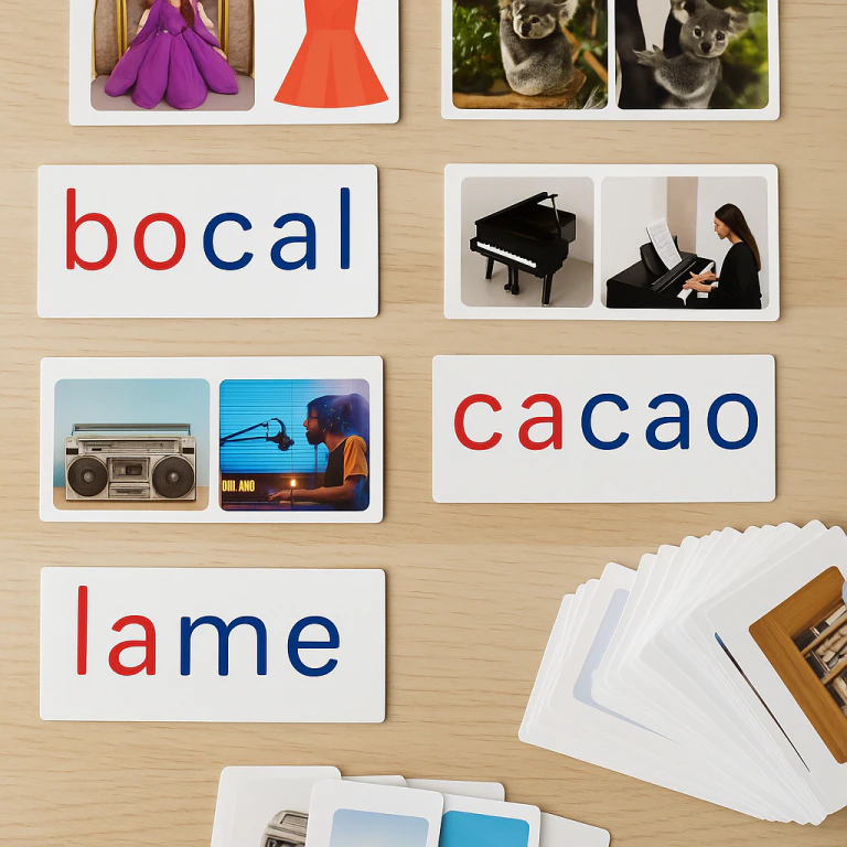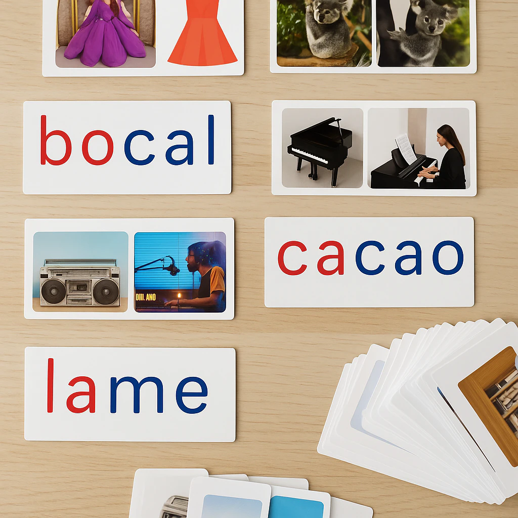 Lot de 36 cartes de lecture pour s’entraîner à lire ses premiers mots découpés en syllabes colorées et s’auto-corriger grâce à l’image au dos.