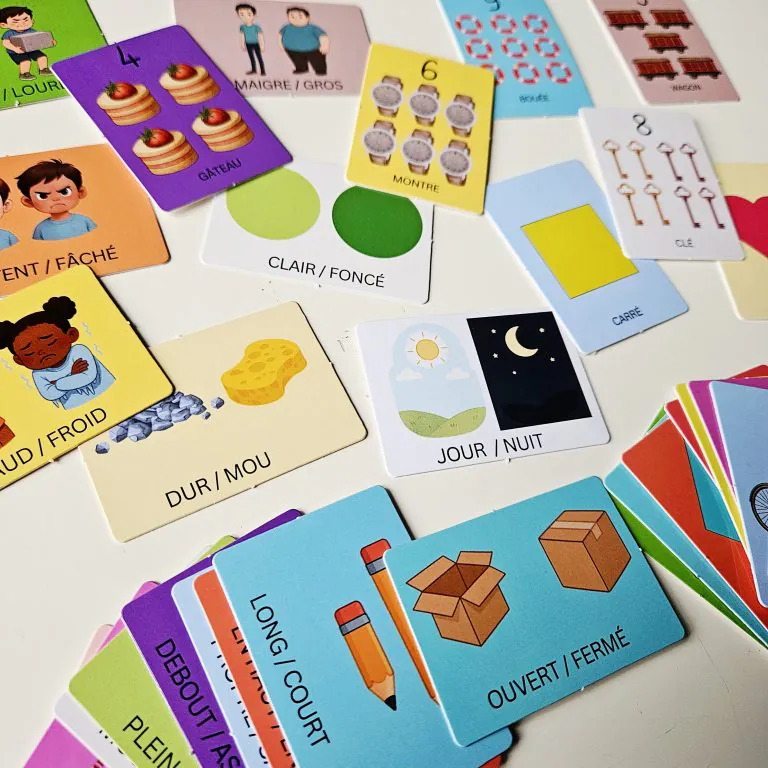 Un jeu de 32 cartes pour découvrir les premiers contraires, les nombres de 1 à 10 et les formes géométriques de façon simple et ludique.