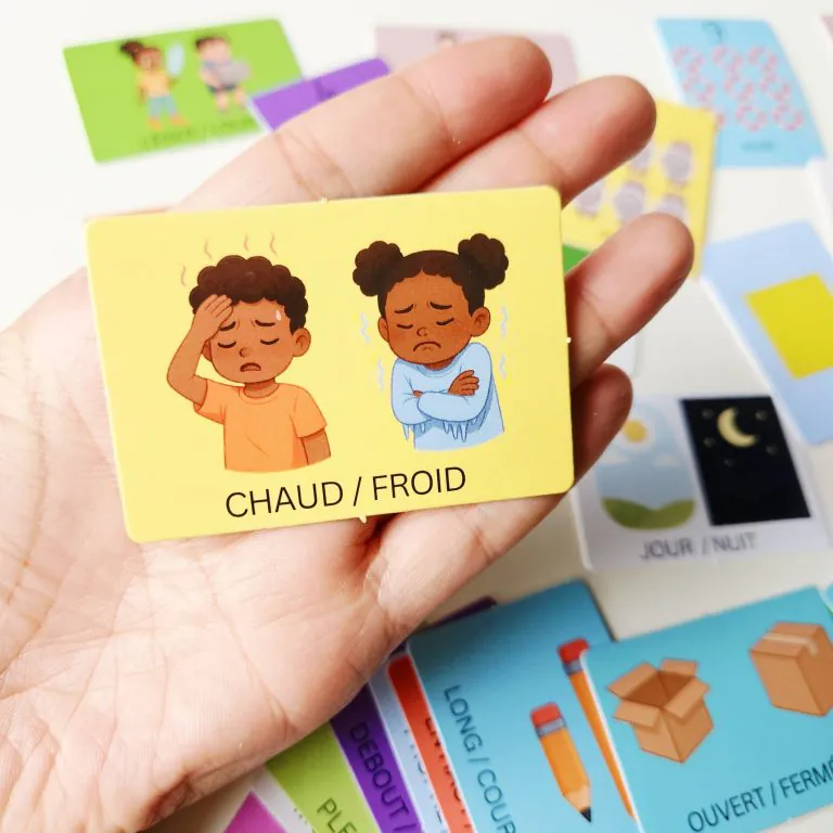 ✔️ Thèmes variés : émotions, objets, tailles, quantités, températures…