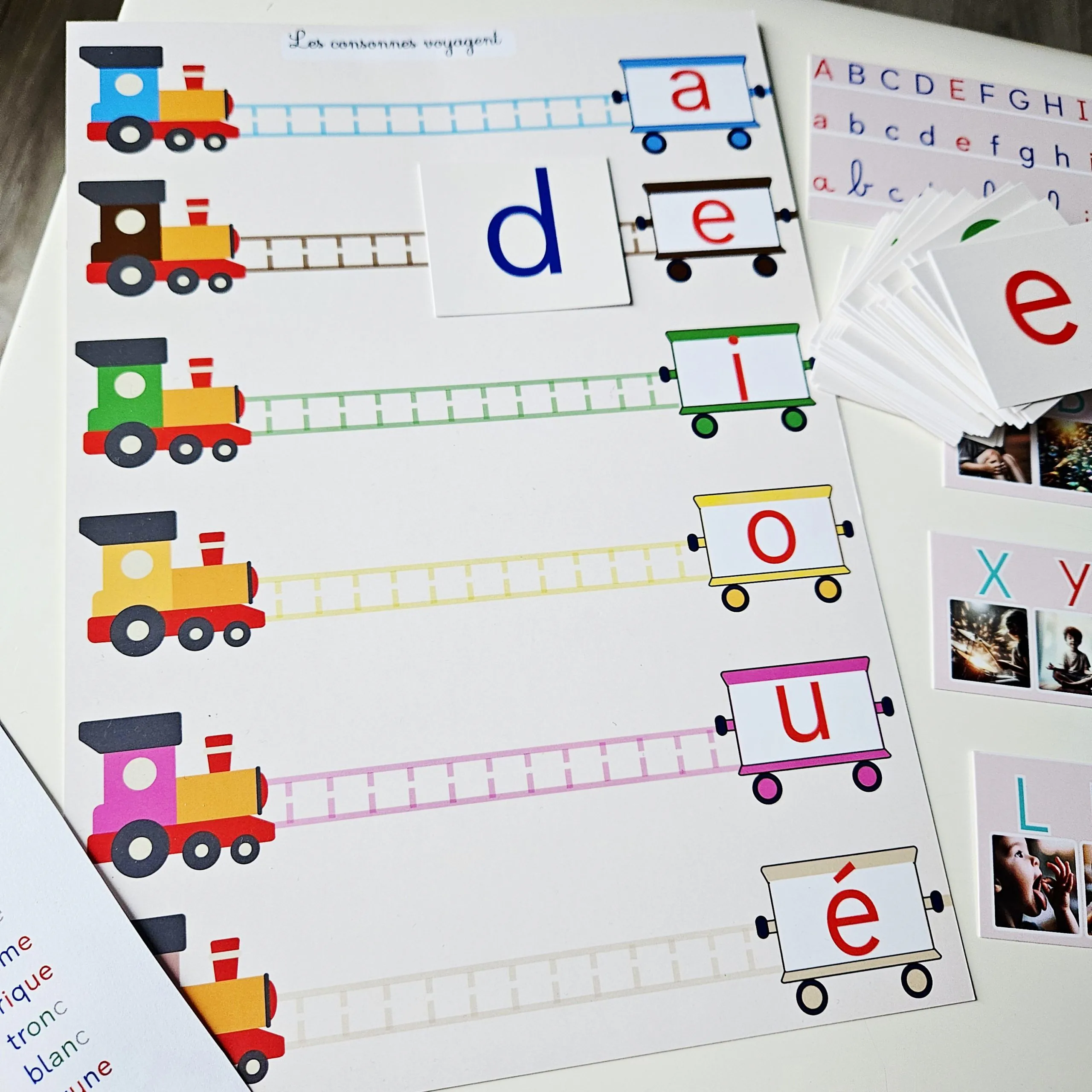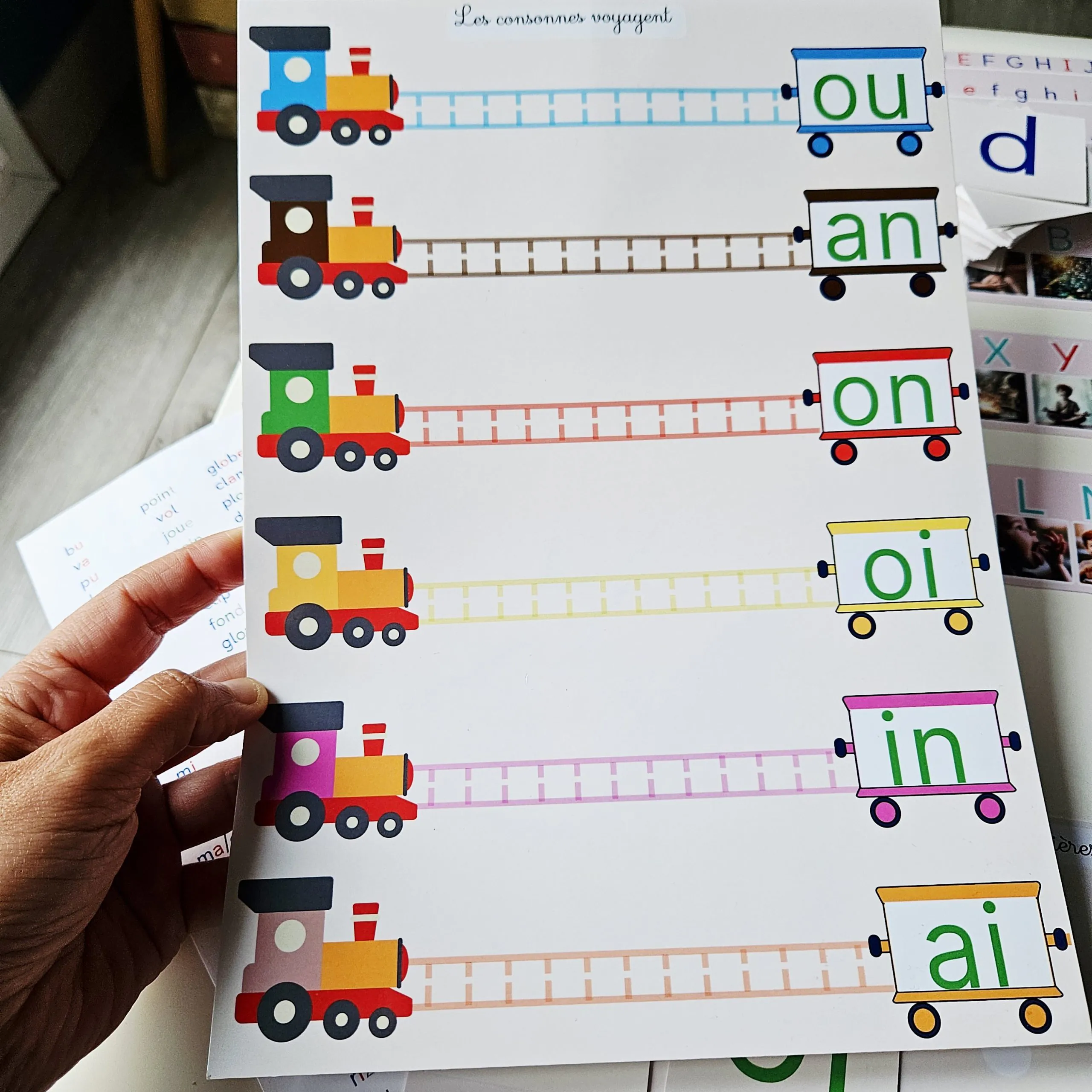 Les planches “Les consonnes voyagent” : pour associer les consonnes aux voyelles ou aux sons complexes et comprendre la construction des syllabes.
