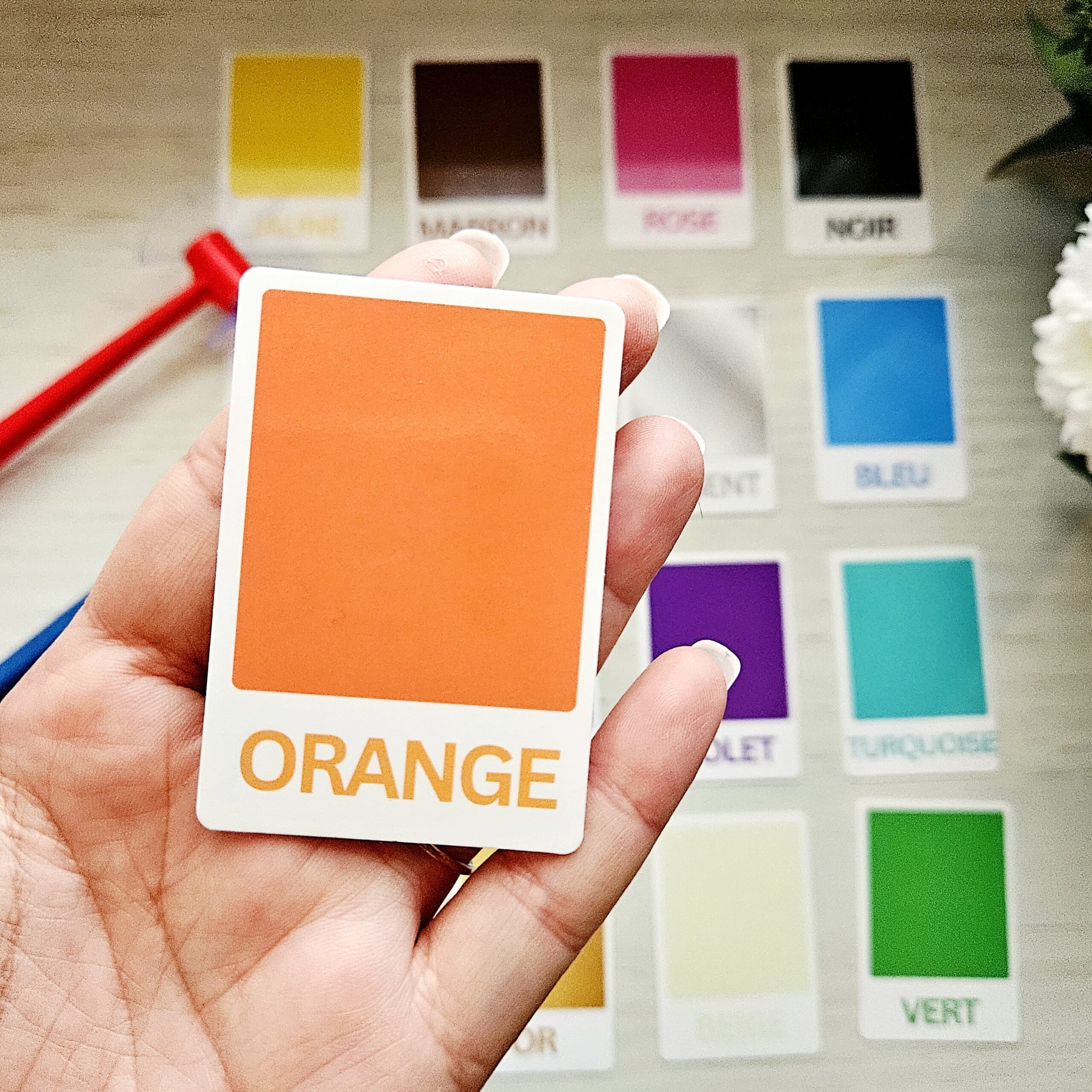 Vous pourrez proposer des jeux autour des couleurs tels que nommer la couleur, désigner la bonne carte après avoir demandé “Où se trouve la couleur bleue”